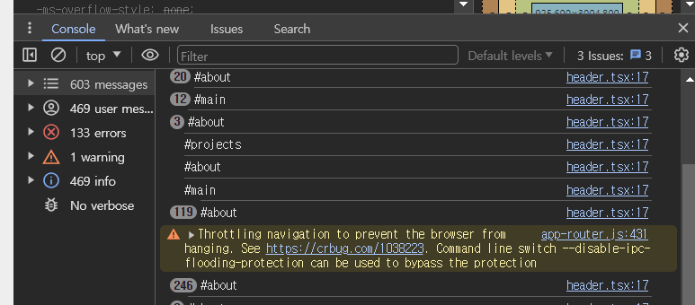 그런데 콘솔 로그를 보니 스크롤 이벤트가 조금만 발생해도 수십 수백 개의 이벤트가 발생하는 것을 발견.